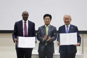 TICAD 9での第6次EPSA発表時の写真:(左から)ケビン・カリウキ アフリカ開発銀行副総裁、加藤勝信 財務大臣、田中明彦 JICA 理事長 (肩書は2025年8月TICAD 9時のもの)